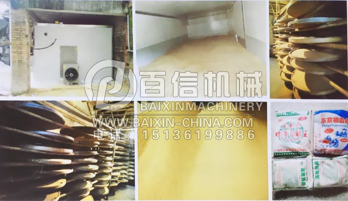 項目位于廣西玉林市博白縣英橋鎮某綜合加工廠,專業生產酒曲,日產量2500斤,酒曲屬微生物酵母菌類,外形像麥皮狀,顆粒小質輕,烘干過程對溫度敏感,全程要求在40℃以下完成烘干;初含水率50%,要求干度13%,15小時烘干完成。