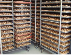 - 此時經(jīng)過前期的階段升溫,可將烘房溫度設置為70℃。持續(xù)運行2小時左右。此時打開門,觀察物料的外觀、干燥程度。待物料有8-9成干時,即可關閉加熱主機,烘房溫度回溫至室溫時即可將烘房內(nèi)的推車取出,將干制后的成品取出。