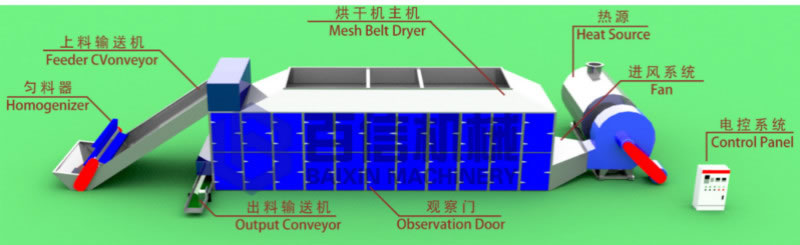 辣椒烘干機也是多層帶式辣椒烘干設(shè)備主要是有:上料系統(tǒng)、烘干系統(tǒng)、加熱系統(tǒng)、出料系統(tǒng)組成,分別包括上料輸送機,均料器,烘干主機,出料輸送機、大風(fēng)機、小風(fēng)機、熱源,傳動機和控制柜。